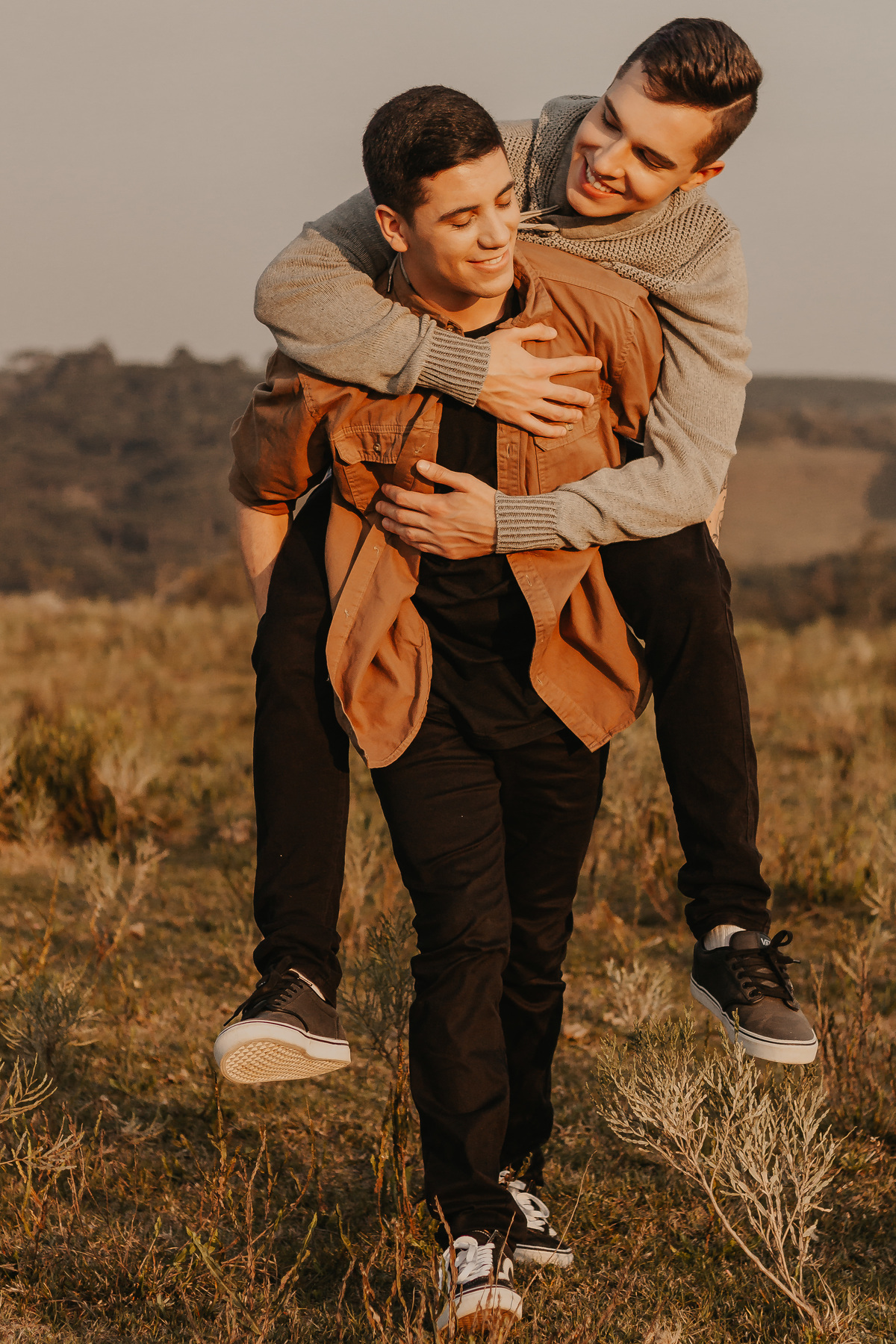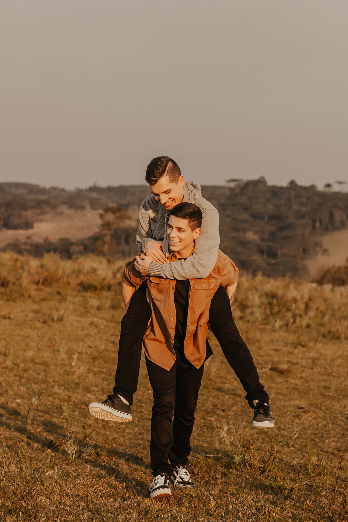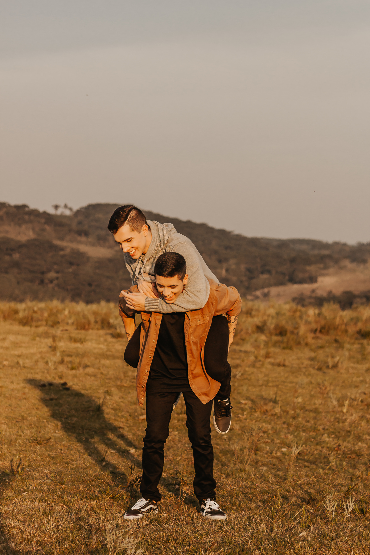 Queríamos fotografar em um lugar diferente, então saímos por aí até encontrar a locação perfeita (obrigada Carol pela carona). E nós temos muita sorte em morar em uma região que tem bastante campos, não foi difícil achar esse local que foi simplesmente perfeito! O dia tava simplesmente incrível, a luz estava super linda, as roupas que eles estavam combinou muito com o local.. e minha gente, que pôr do sol foi aquele, tudo maravilhoso!